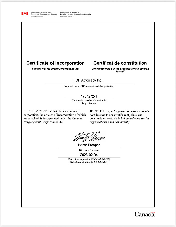 FOF Advocacy Inc. Inc. is a nationally registered corporation operating in Canada. It operates under federal law and regulations as an media distributing company. Here is the authorizing document for the business: